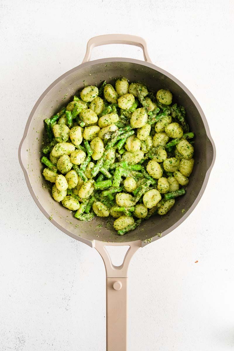- Add the cooked gnocchi to the skillet with the asparagus. Add the pesto sauce and ¼ cup of the reserved cooking liquid. Stir to combine and cook for 1 minute, just until the pesto sauce thickens and evenly coats the gnocchi.